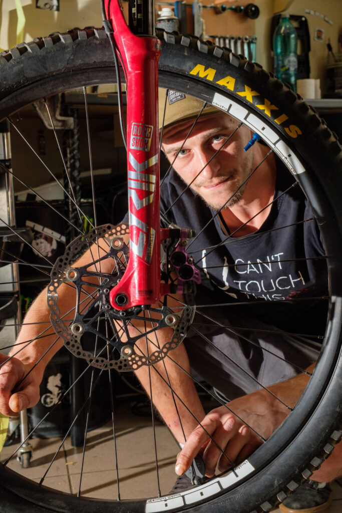 Az egykori cégér helyett azonban a bejárat felett már a Noa név látszik, ami egyébként nem a bolt, hanem egy kerékagy- és felnigyártó neve. Az állványon épp egy kétmillió forint értékű downhill bringa kerekének centírozásán dolgozik a mester. Ez az egyszerűbb munkák közé tartozik. Mint mondja, a hegyi kerékpározás életforma, azaz a srácok nem csak hajtják a bringákat, de az egyszerűbb javításokat maguk is végzik el. Mivel Olivért jól ismerik a sportágban, az sem véletlen, hogy a műhelyébe érkező kerékpárok nagyjából 80 százaléka is downhill gép. Közös jellemzőjük, hogy nem csak az első, hanem a hátsó kerékvilla is teleszkópos, a hidraulika pedig nitrogénnel van töltve. Ezeknek a javításához a tulajdonosoknak nincs szerszámuk, és speciális szakértelmet is igényel. Olivér viszont rendelkezik mindkettővel.